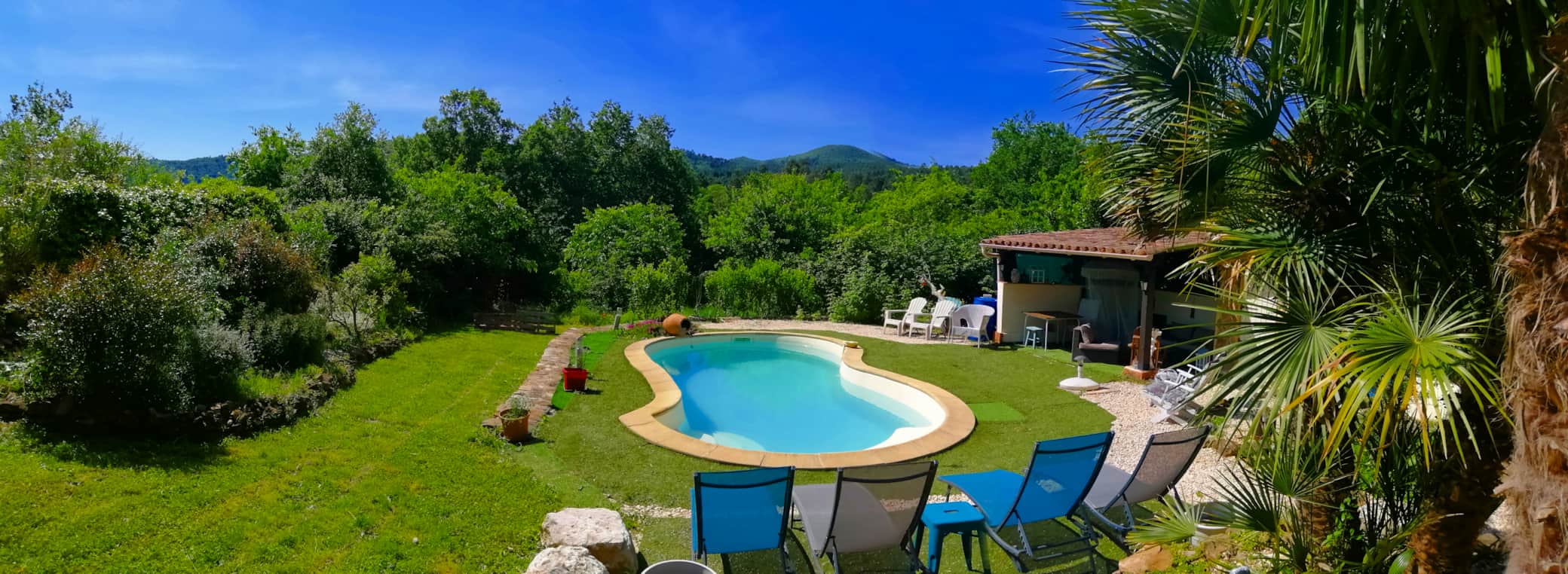 Dans les deux cas, vous bénéficiez en exclusivité de l'ensemble des espaces extérieurs : jardin privatif de 2 000 m², piscine 8×4 m avec pool house et transats, cuisine d'été entièrement équipée avec barbecue, grande terrasse vue sur les montagnes cévenoles, boulodrome, coin braséro pour les soirées estivales et parking privé sur la propriété. Votre hôte Géraldine veille discrètement à votre confort pour un séjour inoubliable.